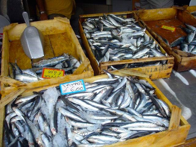 Fresh gavros (anchovies) and sardeles (sardenes) in the market in Chios-town